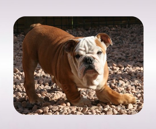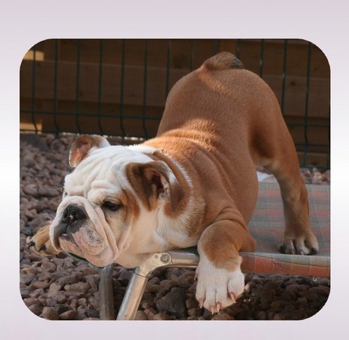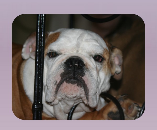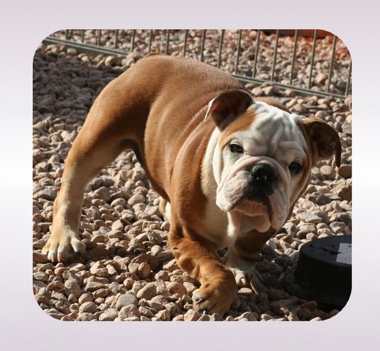 Quelques jours après ma naissance ma maman (Carole) voit que ma cage thoracique s'enfonce, rien de bien grave si prit à temps (syndrome connu chez le Bulldog-Anglais). Alors en dehors des tétées, elle a prit la décision de me mettre en bouteille et en quelques temps ça devrait s'arranger. Mais ça ne se passe pas comme prévu, en grandissant une de mes pattes avant reste droite, mon coude est soudé et en plus mon épaule dévie sur le côté. J'ai une malformation, il faut essayer de minimiser le problème. |
